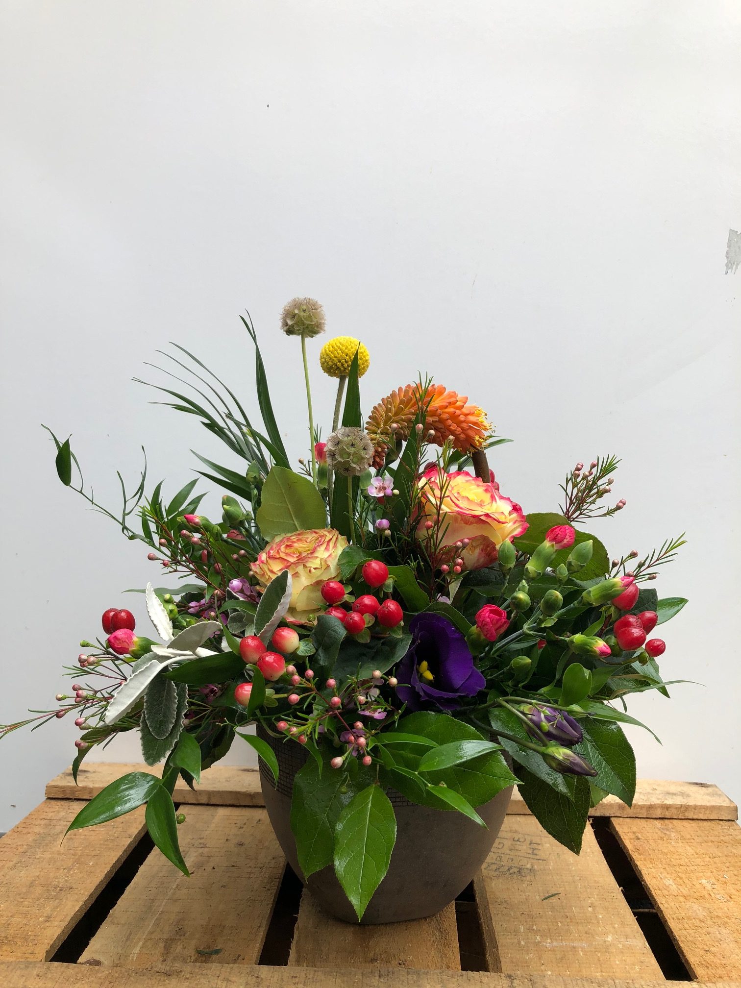 A beautiful arrangement in ceramic pot, filled with fresh seasonal flowers and foliage in shades of oranges, pinks and purples.